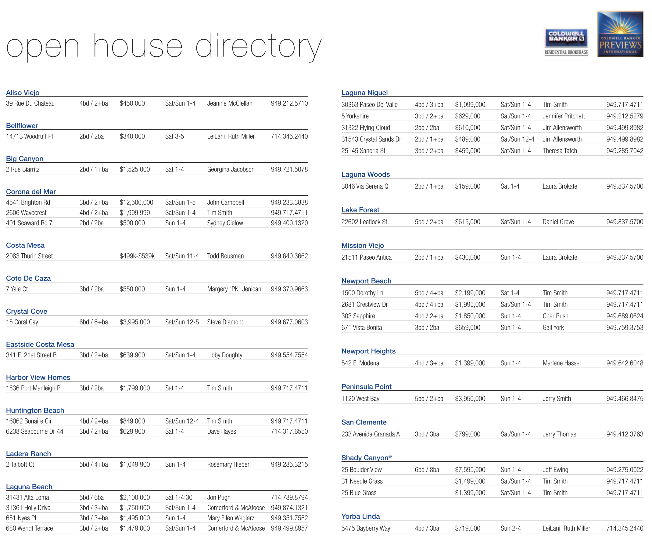 Laguna Niguel 30363 Paseo Del Valle 4bd / 3+ba $1,099,000 Sat/Sun 1-4 Tim Smith 949.717.4711 5 Yorkshire 3bd / 2+ba $629,000 Sat/Sun 1-4 Jennifer Pritchett 949.212.5279 31322 Flying Cloud 2bd / 2ba $610,000 Sat/Sun 1-4 Jim Allensworth 949.499.8982 31543 Crystal Sands Dr 2bd / 1+ba $489,000 Sat/Sun 12-4 Jim Allensworth 949.499.8982 25145 Sanoria St 3bd / 2+ba $459,000 Sat/Sun 1-4 Theresa Tatch 949.285.7042