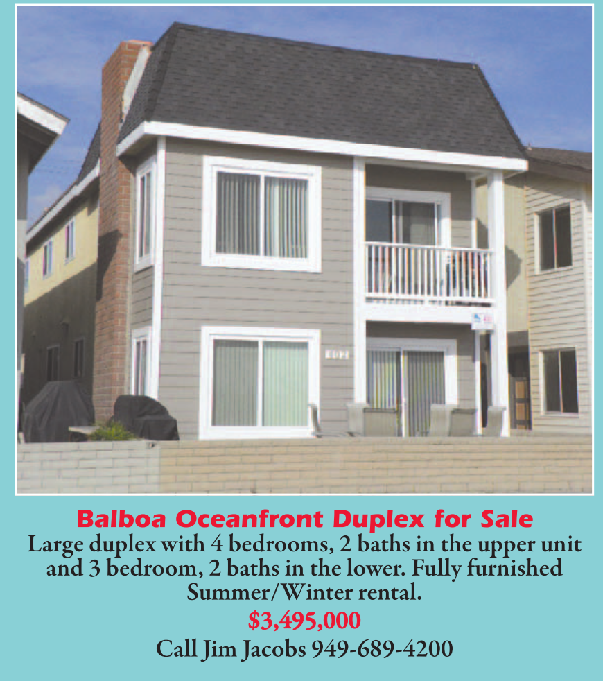 Balboa Oceanfront Duplex for Sale Large duplex with 4 bedrooms, 2 baths in the upper unit and 3 bedroom, 2 baths in the lower. Fully furnished Summer/Winter rental.