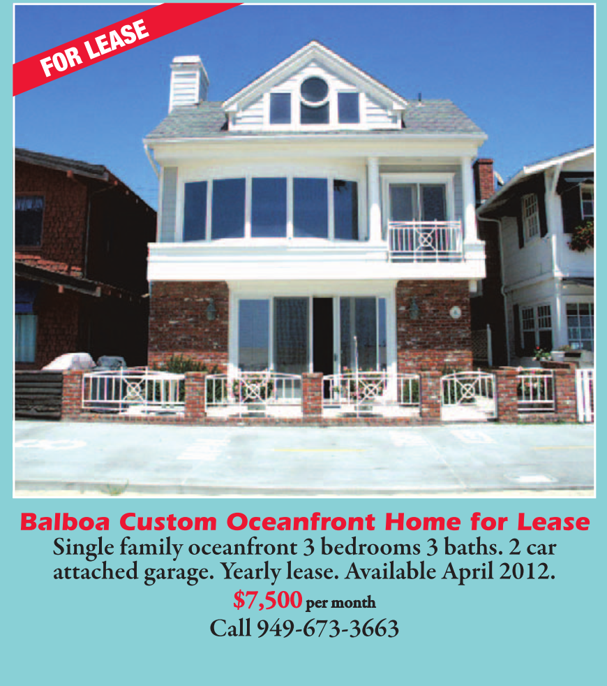 Balboa Custom Oceanfront Home for Lease Single family oceanfront 3 bedrooms 3 baths. 2 car attached garage. Yearly lease. Available April 2012.