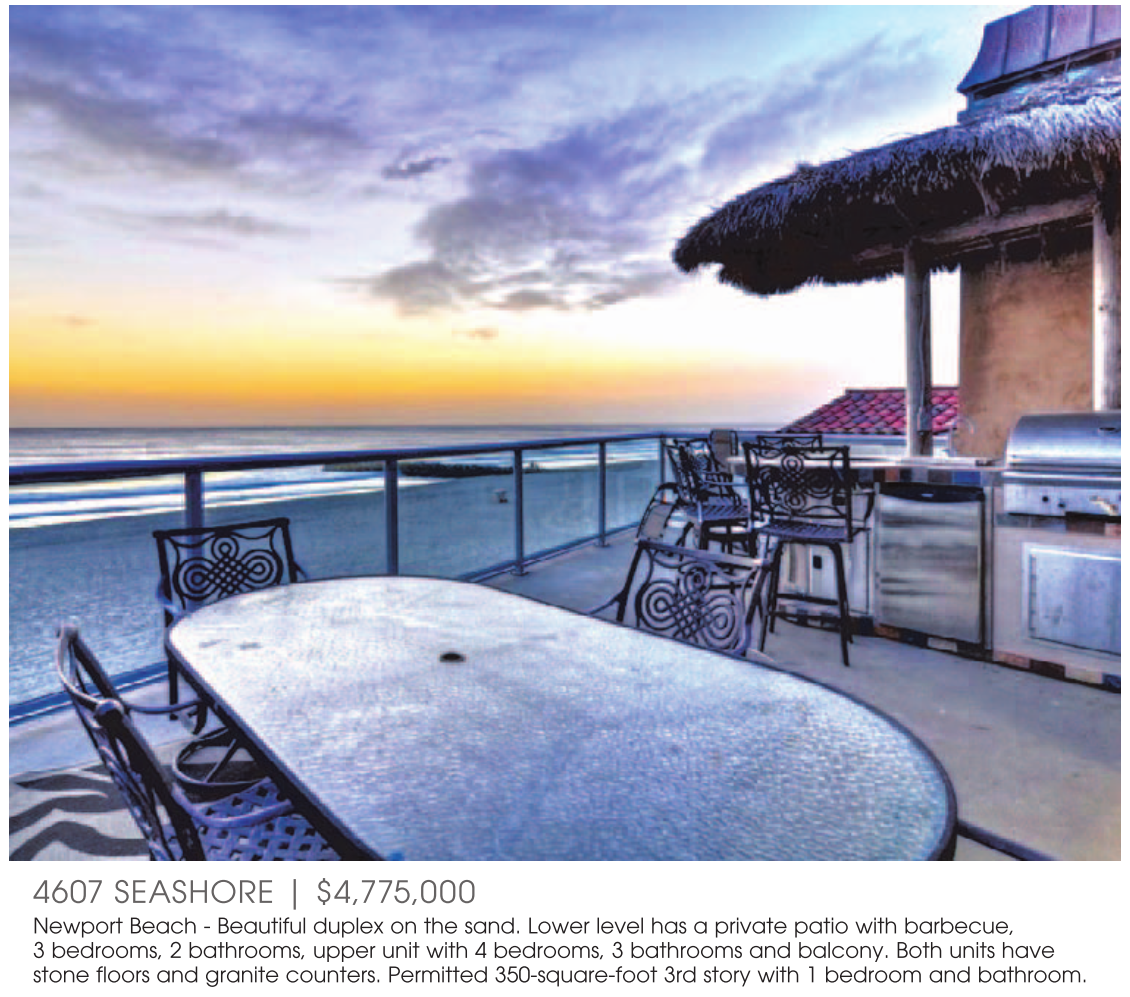 Newport Beach - Beautiful duplex on the sand. Lower level has a private patio with barbecue, 3 bedrooms, 2 bathrooms, upper unit with 4 bedrooms, 3 bathrooms and balcony. Both units have stone floors and granite counters. Permitted 350-square-foot 3rd story with 1 bedroom and bathroom.