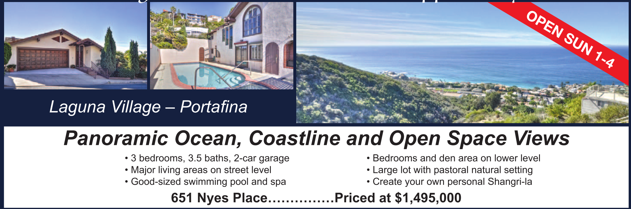 Laguna Village – Portafi na Panoramic Ocean, Coastline and Open Space Views • 3 bedrooms, 3.5 baths, 2-car garage • Major living areas on street level • Good-sized swimming pool and spa • Bedrooms and den area on lower level • Large lot with pastoral natural setting • Create your own personal Shangri-la 651 Nyes Place……………Priced at $1,495,000