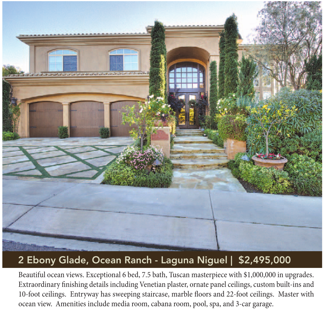 2 Ebony Glade, Ocean Ranch - Laguna Niguel | $2,495,000 Beautiful ocean views. Exceptional 6 bed, 7.5 bath, Tuscan masterpiece with $1,000,000 in upgrades. Extraordinary finishing details including Venetian plaster, ornate panel ceilings, custom built-ins and 10-foot ceilings. Entryway has sweeping staircase, marble floors and 22-foot ceilings. Master with ocean view. Amenities include media room, cabana room, pool, spa, and 3-car garage.