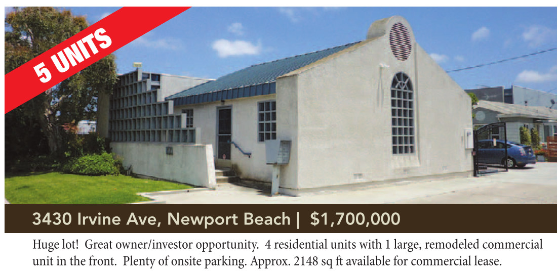 3430 Irvine Ave, Newport Beach | $1,700,000 Huge lot! Great owner/investor opportunity. 4 residential units with 1 large, remodeled commercial unit in the front. Plenty of onsite parking. Approx. 2148 sq ft available for commercial lease.