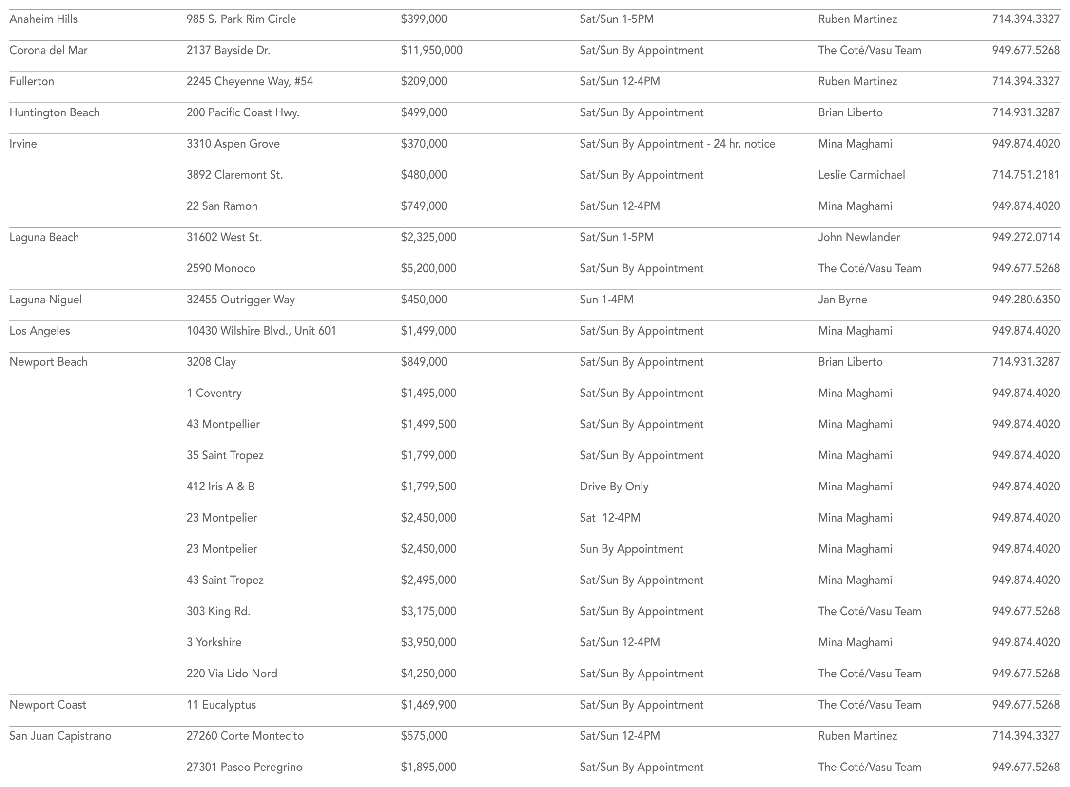3892 Claremont St. $480,000 Sat/Sun By Appointment Leslie Carmichael 714.751.2181 22 San Ramon $749,000 Sat/Sun 12-4PM Mina Maghami 949.874.4020 Laguna Beach 31602 West St. $2,325,000 Sat/Sun 1-5PM John Newlander 949.272.0714 2590 Monoco $5,200,000 Sat/Sun By Appointment The Coté/Vasu Team 949.677.5268 Laguna Niguel 32455 Outrigger Way $450,000 Sun 1-4PM Jan Byrne 949.280.6350 Los Angeles 10430 Wilshire Blvd., Unit 601 $1,499,000 Sat/Sun By Appointment Mina Maghami 949.874.4020 Newport Beach 3208 Clay $849,000 Sat/Sun By Appointment Brian Liberto 714.931.3287 1 Coventry $1,495,000 Sat/Sun By Appointment Mina Maghami 949.874.4020 43 Montpellier $1,499,500 Sat/Sun By Appointment Mina Maghami 949.874.4020 35 Saint Tropez $1,799,000 Sat/Sun By Appointment Mina Maghami 949.874.4020 412 Iris A & B $1,799,500 Drive By Only Mina Maghami 949.874.4020 23 Montpelier $2,450,000 Sat 12-4PM Mina Maghami 949.874.4020 23 Montpelier $2,450,000 Sun By Appointment Mina Maghami 949.874.4020 43 Saint Tropez $2,495,000 Sat/Sun By Appointment Mina Maghami 949.874.4020 303 King Rd. $3,175,000 Sat/Sun By Appointment The Coté/Vasu Team 949.677.5268 3 Yorkshire $3,950,000 Sat/Sun 12-4PM Mina Maghami 949.874.4020 220 Via Lido Nord $4,250,000 Sat/Sun By Appointment The Coté/Vasu Team 949.677.5268 Newport Coast 11 Eucalyptus $1,469,900 Sat/Sun By Appointment The Coté/Vasu Team 949.677.5268 San Juan Capistrano 27260 Corte Montecito $575,000 Sat/Sun 12-4PM Ruben Martinez 714.394.3327 27301 Paseo Peregrino $1,895,000 Sat/Sun By Appointment The Coté/Vasu Team 949.677.5268