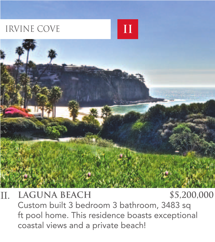 II. LAGUNA BEACH $5,200,000 Custom built 3 bedroom 3 bathroom, 3483 sq ft pool home. This residence boasts exceptional coastal views and a private beach!