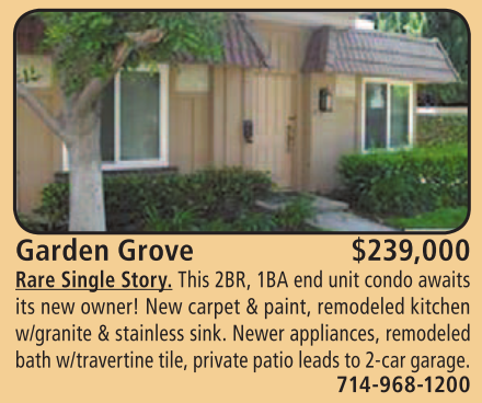 Garden Grove $239,000 Rare Single Story. This 2BR, 1BA end unit condo awaits