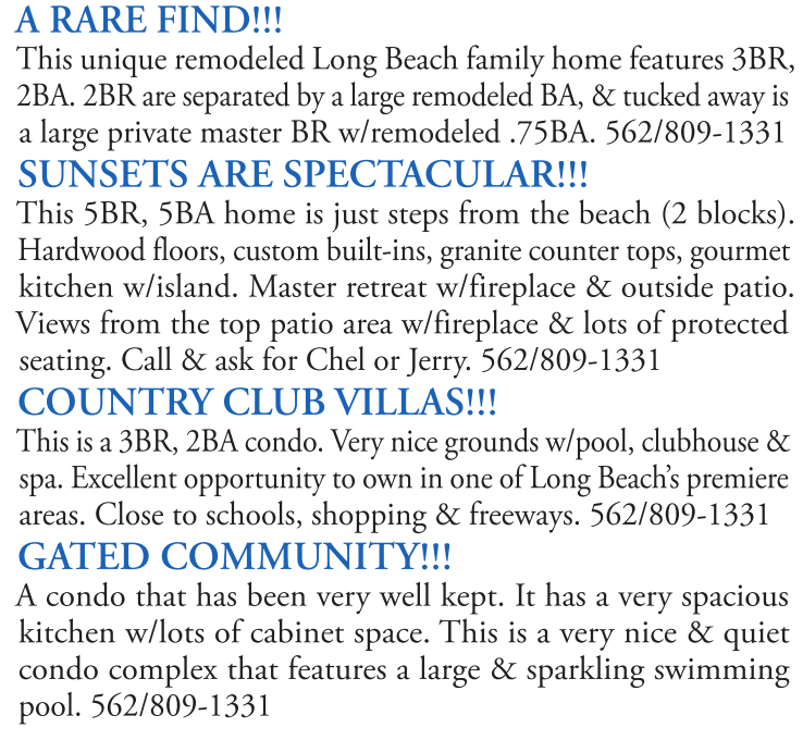 spa. Excellent opportunity to own in one of Long Beach’s premiere areas. Close to schools, shopping & freeways. 562/809-1331 GATED COMMUNITY!!! A condo that has been very well kept. It has a very spacious kitchen w/lots of cabinet space. This is a very nice & quiet condo complex that features a large & sparkling swimming pool. 562/809-1331
