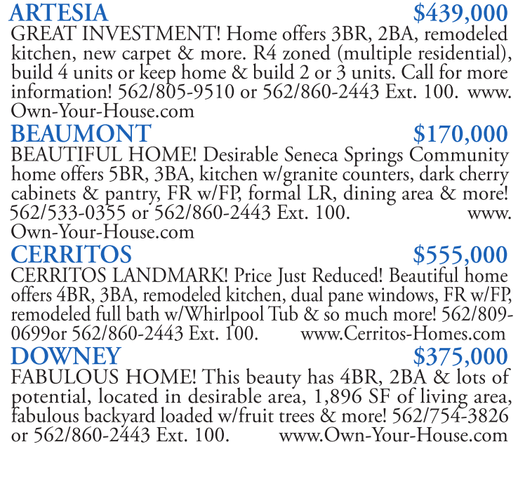ARTESIA $439,000 GREAT INVESTMENT! Home offers 3BR, 2BA, remodeled kitchen, new carpet & more. R4 zoned (multiple residential), build 4 units or keep home & build 2 or 3 units. Call for more information! 562/805-9510 or 562/860-2443 Ext. 100. www. Own-Your-House.com BEAUMONT $170,000 BEAUTIFUL HOME! Desirable Seneca Springs Community home offers 5BR, 3BA, kitchen w/granite counters, dark cherry cabinets & pantry, FR w/FP, formal LR, dining area & more!