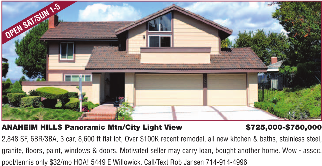 ANAHEIM HILLS Panoramic Mtn/City Light View $725,000-$750,000 2,848 SF, 6BR/3BA, 3 car, 8,600 ft flat lot, Over $100K recent remodel, all new kitchen & baths, stainless steel, granite, floors, paint, windows & doors. Motivated seller may carry loan, bought another home. Wow - assoc. pool/tennis only $32/mo HOA! 5449 E Willowick. Call/Text Rob Jansen 714-914-4996