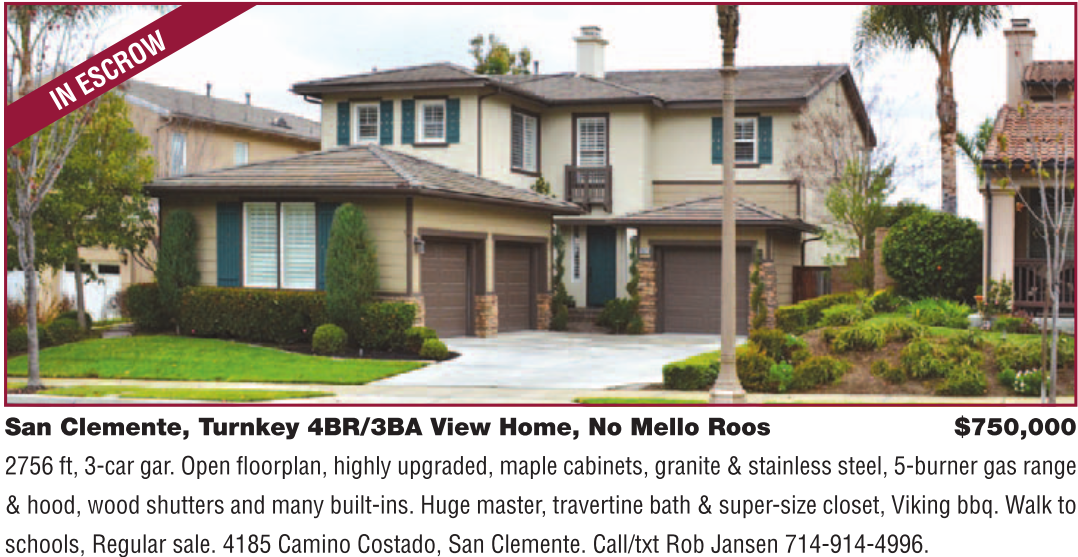 San Clemente, Turnkey 4BR/3BA View Home, No Mello Roos $750,000 2756 ft, 3-car gar. Open floorplan, highly upgraded, maple cabinets, granite & stainless steel, 5-burner gas range & hood, wood shutters and many built-ins. Huge master, travertine bath & super-size closet, Viking bbq. Walk to schools, Regular sale. 4185 Camino Costado, San Clemente. Call/txt Rob Jansen 714-914-4996.