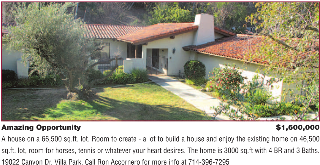 Amazing Opportunity $1,600,000 A house on a 66,500 sq.ft. lot. Room to create - a lot to build a house and enjoy the existing home on 46,500 sq.ft. lot, room for horses, tennis or whatever your heart desires. The home is 3000 sq.ft with 4 BR and 3 Baths. 19022 Canyon Dr. Villa Park. Call Ron Accornero for more info at 714-396-7295