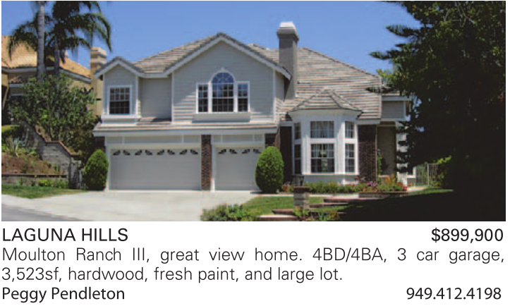 LAGUNA HILLS $899,900 Moulton Ranch III, great view home. 4BD/4BA, 3 car garage, 3,523sf, hardwood, fresh paint, and large lot. Peggy Pendleton 949.412.4198