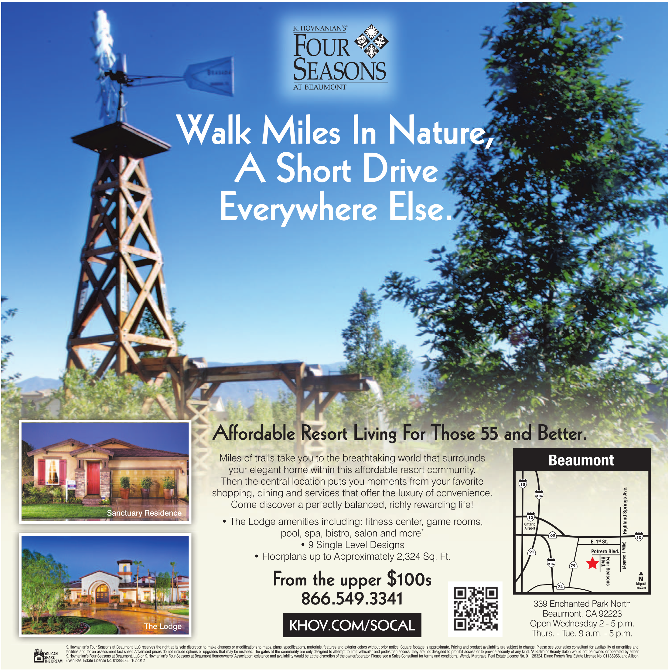 Walk Miles In Nature, A Short Drive Everywhere Else. Sanctuary Residence The Lodge Affordable Resort Living For Those 55 and Better. Miles of trails take you to the breathtaking world that surrounds your elegant home within this affordable resort community. Then the central location puts you moments from your favorite shopping, dining and services that offer the luxury of convenience. Come discover a perfectly balanced, richly rewarding life! • The Lodge amenities including: fitness center, game rooms, pool, spa, bistro, salon and more * • 9 Single Level Designs • Floorplans up to Approximately 2,324 Sq. Ft. From the upper $100s 866.549.3341 KHOV.COM/SOCAL Ontario Airport E. 1 st St. Potrero Blvd. 339 Enchanted Park North Beaumont, CA 92223 Open Wednesday 2 - 5 p.m. Thurs. - Tue. 9 a.m. - 5 p.m. K. Hovnanian’s Four Seasons at Beaumont, LLC reserves the right at its sole discretion to make changes or modifications to maps, plans, specifications, materials, features and exterior colors without prior notice. Square footage is approximate. Pricing and product availability are subject to change. Please see your sales consultant for availability of amenities and facilities and for an assessment fact sheet. Advertised prices do not include options or upgrades that may be installed. The gates at the community are only designed to attempt to limit vehicular and pedestrian access; they are not designed to prohibit access or to provide security of any kind. *A Bistro or Beauty Salon would not be owned or operated by either K. Hovnanian’s Four Seasons at Beaumont, LLC or K. Hovnanian’s Four Seasons at Beaumont Homeowners’ Association; existence and availability would be at the discretion of the owner/operator. Please see a Sales Consultant for terms and conditions. Wendy Margrave, Real Estate License No. 01128324, Diane French Real Estate License No. 01185956, and Allison Erwin Real Estate License No. 01398565. 10/2012