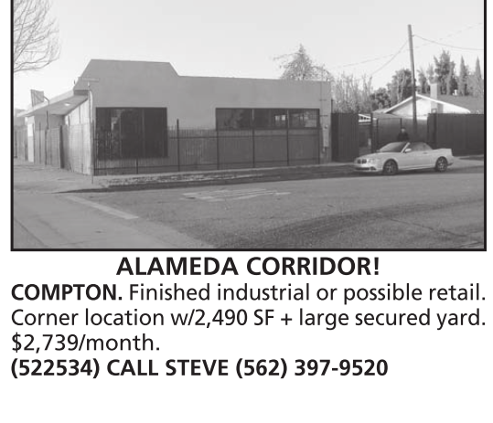 COMPTON. Finished industrial or possible retail. Corner location w/2,490 SF + large secured yard. $2,739/month. (522534) CALL STEVE (562) 397-9520