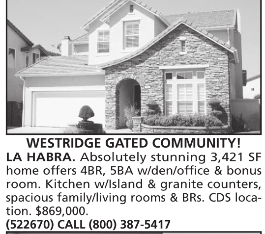 LA HABRA. Absolutely stunning 3,421 SF home offers 4BR, 5BA w/den/office & bonus room. Kitchen w/Island & granite counters, spacious family/living rooms & BRs. CDS location. $869,000.