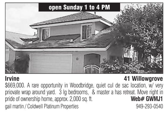 Irvine 41 Willowgrove $669,000. A rare opportunity in Woodbridge, quiet cul de sac location, w/ very priovate wrap around yard. 3 lg bedrooms, & master a has retreat. Move right in pride of ownership home, approx. 2,000 sq. ft. Web# GWMJ1 gail martin / Coldwell Platinum Properties 949-293-0540