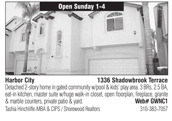 Harbor City 1336 Shadowbrook Terrace Detached 2-story home in gated community w/pool & kids’ play area. 3 BRs, 2.5 BA, eat-in kitchen, master suite w/huge walk-in closet, open floorplan, fireplace, granite & marble counters, private patio & yard. Web# GWNC1 Tashia Hinchliffe-MBA & CIPS / Shorewood Realtors 310-383-7057