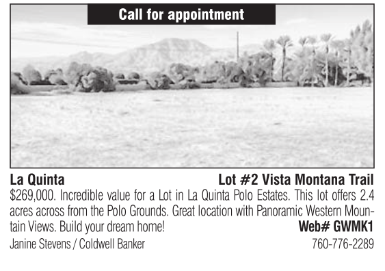 La Quinta Lot #2 Vista Montana Trail $269,000. Incredible value for a Lot in La Quinta Polo Estates. This lot offers 2.4 acres across from the Polo Grounds. Great location with Panoramic Western Mountain Views. Build your dream home! Web# GWMK1