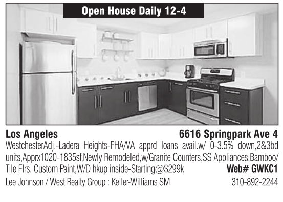 Los Angeles 6616 Springpark Ave 4 WestchesterAdj.-Ladera Heights-FHA/VA apprd loans avail.w/ 0-3.5% down,2&3bd units,Apprx1020-1835sf,Newly Remodeled,w/Granite Counters,SS Appliances,Bamboo/ Tile Flrs. Custom Paint,W/D hkup inside-Starting@$299k Web# GWKC1