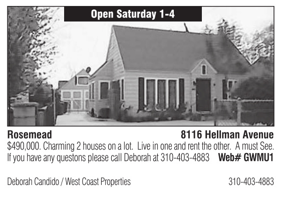 Rosemead 8116 Hellman Avenue $490,000. Charming 2 houses on a lot. Live in one and rent the other. A must See. If you have any questons please call Deborah at 310-403-4883 Web# GWMU1
