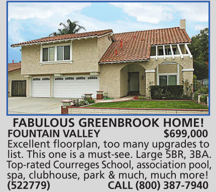FOUNTAIN VALLEY $699,000 Excellent floorplan, too many upgrades to list. This one is a must-see. Large 5BR, 3BA. Top-rated Courreges School, association pool, spa, clubhouse, park & much, much more! (522779) CALL (800) 387-7940