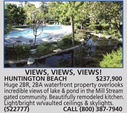 HUNTINGTON BEACH $237,900 Huge 2BR, 2BA waterfront property overlooks incredible views of lake & pond in the Mill Stream gated community. Beautifully remodeled kitchen. Light/bright w/vaulted ceilings & skylights. (522777) CALL (800) 387-7940