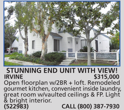 IRVINE $315,000 Open floorplan w/2BR + loft. Remodeled gourmet kitchen, convenient inside laundry, great room w/vaulted ceilings & FP. Light & bright interior. (522983) CALL (800) 387-7930
