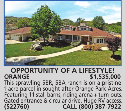 OPPORTUNITY OF A LIFESTYLE! ORANGE $1,535,000 This sprawling 5BR, 5BA ranch is on a pristine 1-acre parcel in sought after Orange Park Acres. Featuring 11 stall barns, riding arena + turn-outs. Gated entrance & circular drive. Huge RV access. (522760) CALL (800) 387-7922