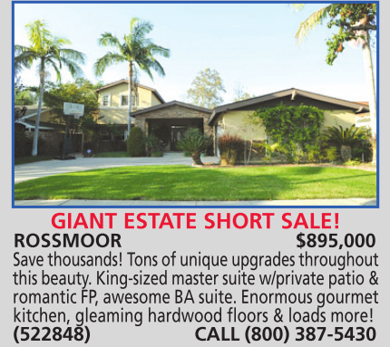 ROSSMOOR $895,000 Save thousands! Tons of unique upgrades throughout this beauty. King-sized master suite w/private patio & romantic FP, awesome BA suite. Enormous gourmet kitchen, gleaming hardwood floors & loads more! (522848) CALL (800) 387-5430