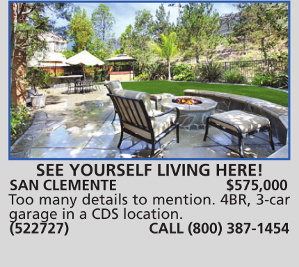 SAN CLEMENTE $575,000 Too many details to mention. 4BR, 3-car garage in a CDS location. (522727) CALL (800) 387-1454