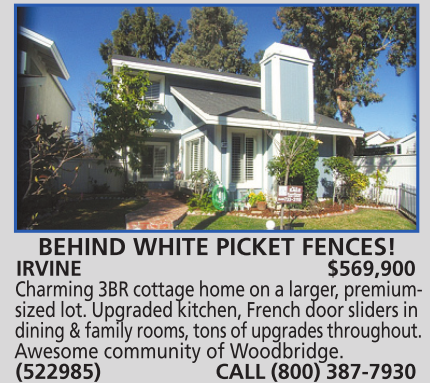BEHIND WHITE PICKET FENCES! IRVINE $569,900 Charming 3BR cottage home on a larger, premiumsized lot. Upgraded kitchen, French door sliders in dining & family rooms, tons of upgrades throughout. Awesome community of Woodbridge. (522985) CALL (800) 387-7930