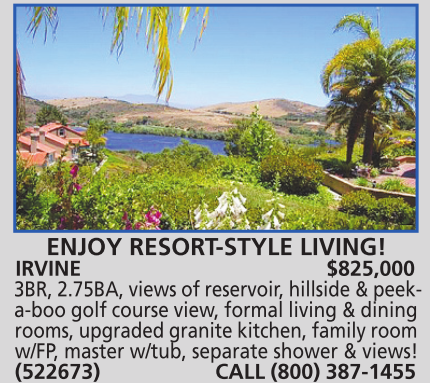 ENJOY RESORT-STYLE LIVING! IRVINE $825,000 3BR, 2.75BA, views of reservoir, hillside & peeka-boo golf course view, formal living & dining rooms, upgraded granite kitchen, family room w/FP, master w/tub, separate shower & views! (522673) CALL (800) 387-1455