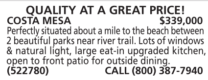COSTA MESA $339,000 Perfectly situated about a mile to the beach between 2 beautiful parks near river trail. Lots of windows & natural light, large eat-in upgraded kitchen, open to front patio for outside dining.