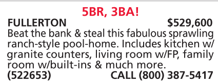 FULLERTON $529,600 Beat the bank & steal this fabulous sprawling ranch-style pool-home. Includes kitchen w/ granite counters, living room w/FP, family room w/built-ins & much more. (522653) CALL (800) 387-5417