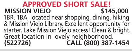 MISSION VIEJO $145,000 1BR, 1BA, located near shopping, dining, hiking & Mission Viejo Library. Excellent opportunity for starter. Lake Mission Viejo access! Clean & bright. Great location in lovely neighborhood. (522726) CALL (800) 387-1454