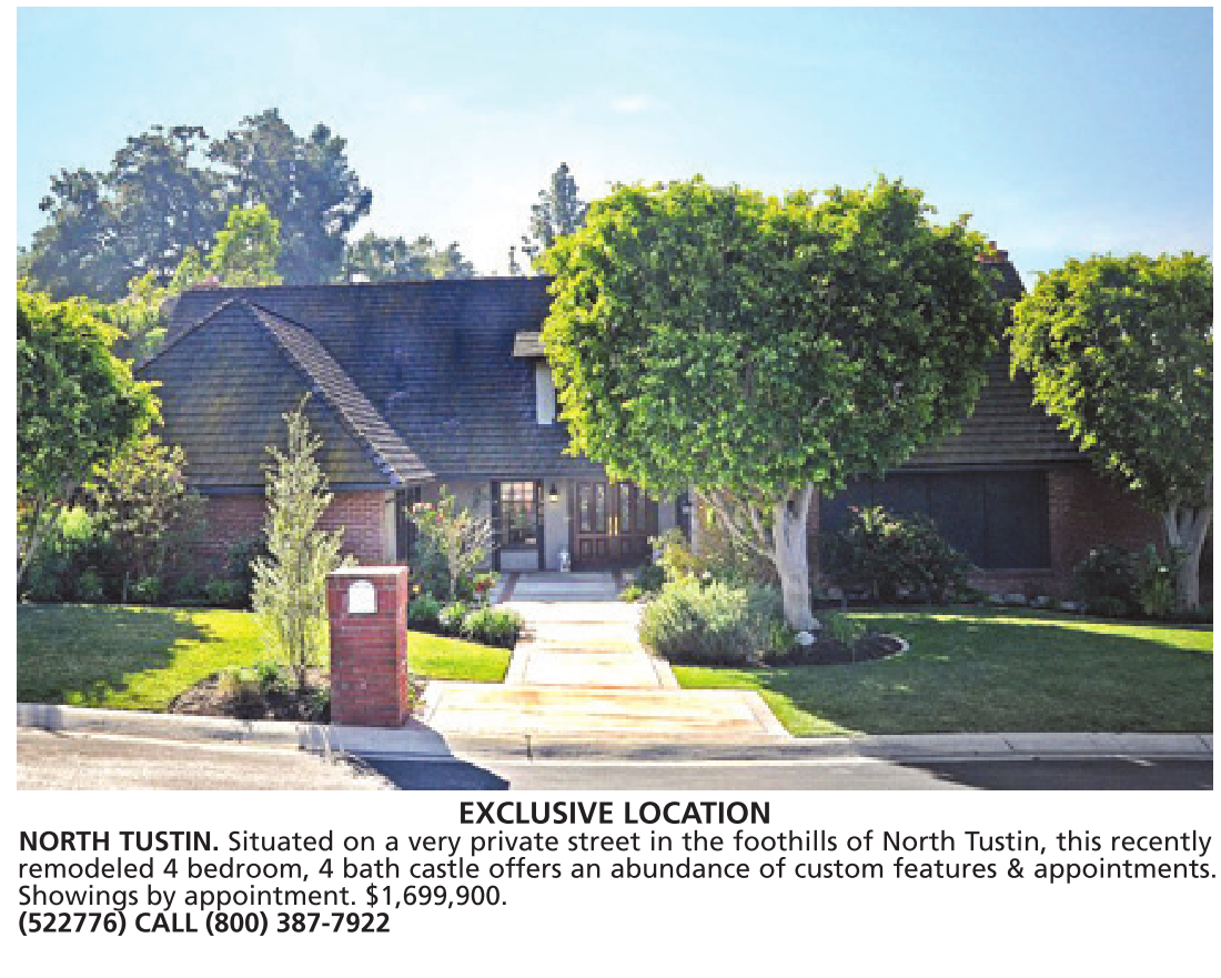 EXCLUSIVE LOCATION NORTH TUSTIN. Situated on a very private street in the foothills of North Tustin, this recently remodeled 4 bedroom, 4 bath castle offers an abundance of custom features & appointments. Showings by appointment. $1,699,900. (522776) CALL (800) 387-7922