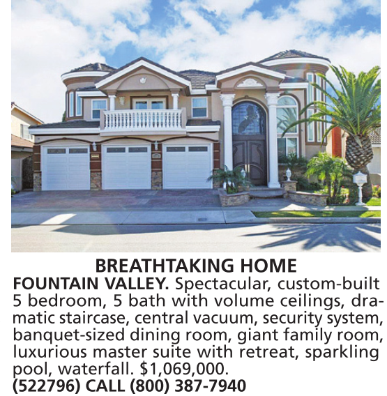 whitewater, BREATHTAKING HOME FOUNTAIN VALLEY. Spectacular, custom-built 5 bedroom, 5 bath with volume ceilings, dramatic staircase, central vacuum, security system, banquet-sized dining room, giant family room, luxurious master suite with retreat, sparkling pool, waterfall. $1,069,000. (522796) CALL (800) 387-7940