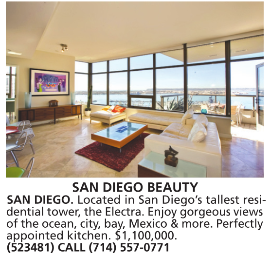 SAN DIEGO BEAUTY SAN DIEGO. Located in San Diego’s tallest residential tower, the Electra. Enjoy gorgeous views of the ocean, city, bay, Mexico & more. Perfectly appointed kitchen. $1,100,000.