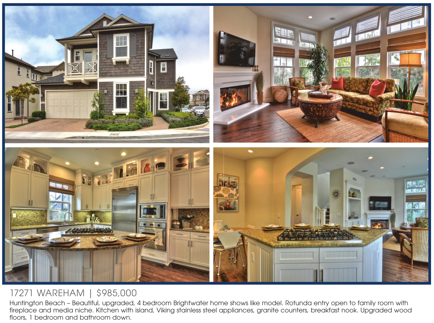 17271 WAREHAM | $985,000 Huntington Beach – Beautiful, upgraded, 4 bedroom Brightwater home shows like model. Rotunda entry open to family room with fireplace and media niche. Kitchen with island, Viking stainless steel appliances, granite counters, breakfast nook. Upgraded wood floors, 1 bedroom and bathroom down.