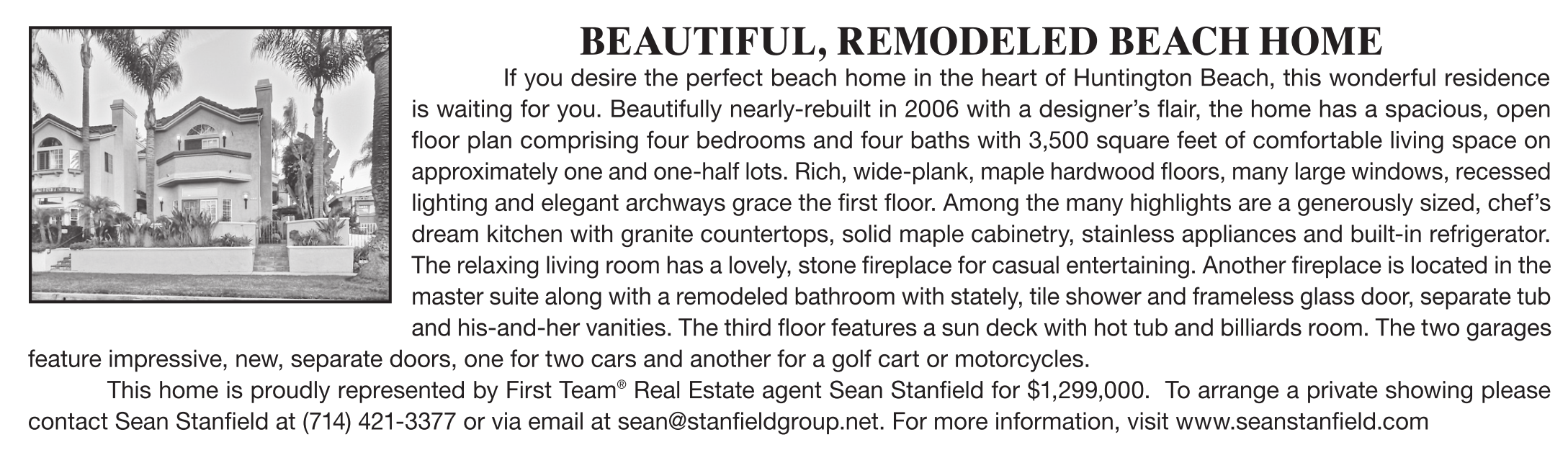This home is proudly represented by First Team ® Real Estate agent Sean Stanfield for $1,299,000. To arrange a private showing please contact Sean Stanfield at (714) 421-3377 or via email at sean@stanfieldgroup.net. For more information, visit www.seanstanfield.com