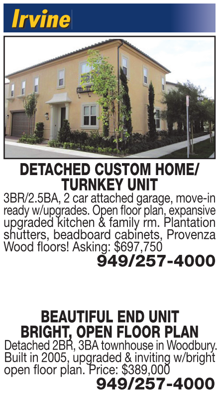 guests). level. spa. Irvine DETACHED CUSTOM HOME/ TURNKEY UNIT 3BR/2.5BA, 2 car attached garage, move-in ready w/upgrades. Open floor plan, expansive upgraded kitchen & family rm. Plantation shutters, beadboard cabinets, Provenza Wood floors! Asking: $697,750 949/257-4000 BEAUTIFUL END UNIT BRIGHT, OPEN FLOOR PLAN Detached 2BR, 3BA townhouse in Woodbury. Built in 2005, upgraded & inviting w/bright open floor plan. Price: $389,000 949/257-4000