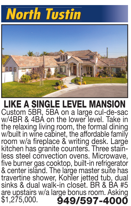 North Tustin LIKE A SINGLE LEVEL MANSION Custom 5BR, 5BA on a large cul-de-sac w/4BR & 4BA on the lower level. Take in the relaxing living room, the formal dining w/built in wine cabinet, the affordable family room w/a fireplace & writing desk. Large kitchen has granite counters. Three stainless steel convection ovens. Microwave, five burner gas cooktop, built-in refrigerator & center island. The large master suite has travertine shower, Kohler jetted tub, dual sinks & dual walk-in closet. BR & BA #5 are upstairs w/a large bonus room. Asking $1,275,000. 949/597-4000