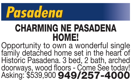 Opportunity to own a wonderful single family detached home set in the heart of Historic Pasadena. 3 bed, 2 bath, arched doorways, wood floors - Come See today! Asking: $539,900 949/257-4000