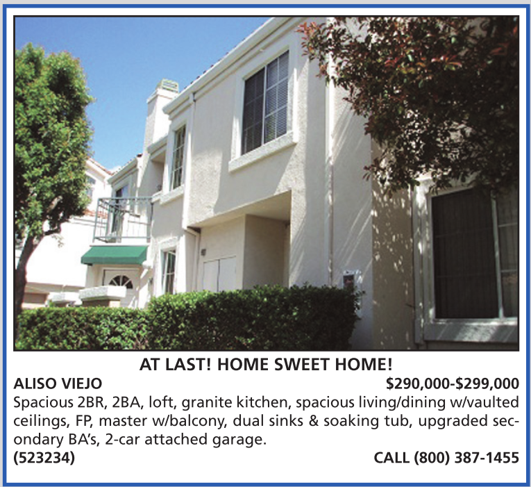 ALISO VIEJO $290,000-$299,000 Spacious 2BR, 2BA, loft, granite kitchen, spacious living/dining w/vaulted ceilings, FP, master w/balcony, dual sinks & soaking tub, upgraded secondary BA’s, 2-car attached garage.