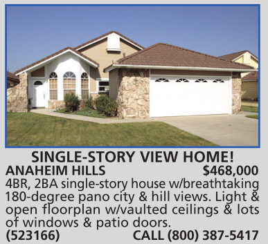 ANAHEIM HILLS $468,000 4BR, 2BA single-story house w/breathtaking 180-degree pano city & hill views. Light & open floorplan w/vaulted ceilings & lots of windows & patio doors.
