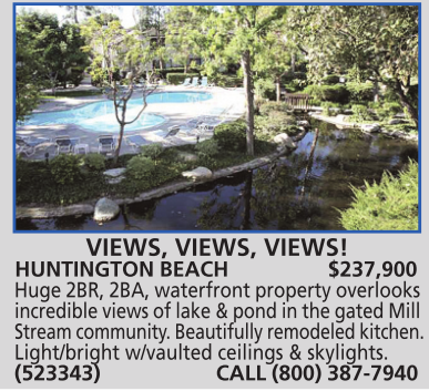 HUNTINGTON BEACH $237,900 Huge 2BR, 2BA, waterfront property overlooks incredible views of lake & pond in the gated Mill Stream community. Beautifully remodeled kitchen. Light/bright w/vaulted ceilings & skylights. (523343) CALL (800) 387-7940