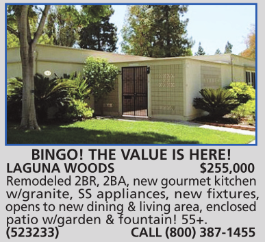 LAGUNA WOODS $255,000 Remodeled 2BR, 2BA, new gourmet kitchen w/granite, SS appliances, new fixtures, opens to new dining & living area, enclosed patio w/garden & fountain! 55+. (523233) CALL (800) 387-1455