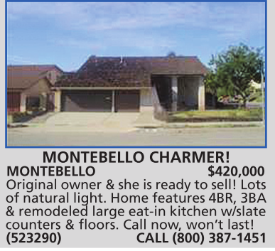 MONTEBELLO $420,000 Original owner & she is ready to sell! Lots of natural light. Home features 4BR, 3BA & remodeled large eat-in kitchen w/slate counters & floors. Call now, won’t last!