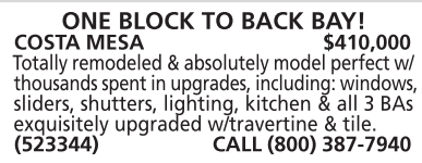 COSTA MESA $410,000 Totally remodeled & absolutely model perfect w/ thousands spent in upgrades, including: windows, sliders, shutters, lighting, kitchen & all 3 BAs exquisitely upgraded w/travertine & tile. (523344) CALL (800) 387-7940