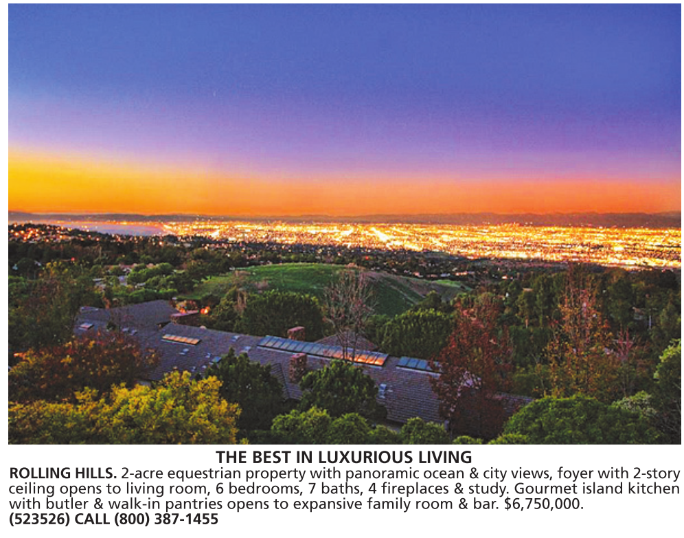 THE BEST IN LUXURIOUS LIVING ROLLING HILLS. 2-acre equestrian property with panoramic ocean & city views, foyer with 2-story ceiling opens to living room, 6 bedrooms, 7 baths, 4 fireplaces & study. Gourmet island kitchen with butler & walk-in pantries opens to expansive family room & bar. $6,750,000. (523526) CALL (800) 387-1455